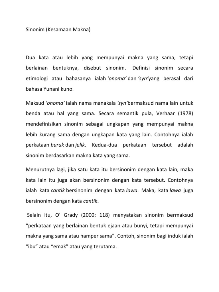 Ia diletakkan di tengah kalimat dan didahului oleh koma. Sinonim adalah satu takson spesies memiliki banyak nama. Sinonim adalah bentuk bahasa yang maknanya sama atau mirip dengan bentuk bahasa lain Padanan Kata Sandingan Kata.