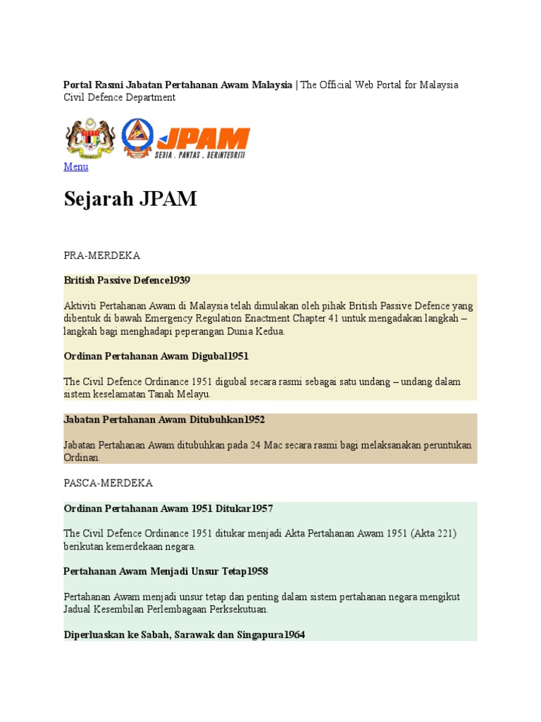 PENGENALAN Di Malaysia Jabatan Pertahanan Awam dimulakan oleh pihak British pada tahun 1939 sebagai Passive Defence yang dibentuk di bawah Emergency Regulation Enactment. SEJARAH PENUBUHAN JPAM Pada tahun 1939 Aktiviti Pertahanan Awam di Malaysia telah dimulakan oleh pihak British sebagai Passive Defence yang dibentuk di bawah Emergency Regulation Enactment Chapter 41 untuk mengadakan langkah-langkah bagi menghadapi Peperangan Dunia Kedua. Sistem Maklumat Pengurusan Kenderaan.