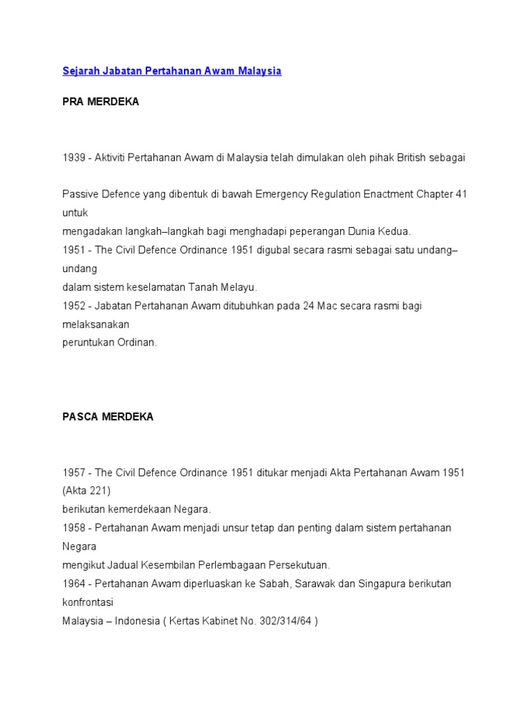 Sejarah jabatan pertahanan awam malaysia. ANGKATAN PERTAHANAN AWAM MALAYSIA MALAYSIA CIVIL DEFENCE FORCE LT. PENGENALAN Di Malaysia Jabatan Pertahanan Awam dimulakan oleh pihak British pada tahun 1939 sebagai Passive Defence yang dibentuk di bawah Emergency Regulation Enactment Chapter 41. Public domain Public domain false false.