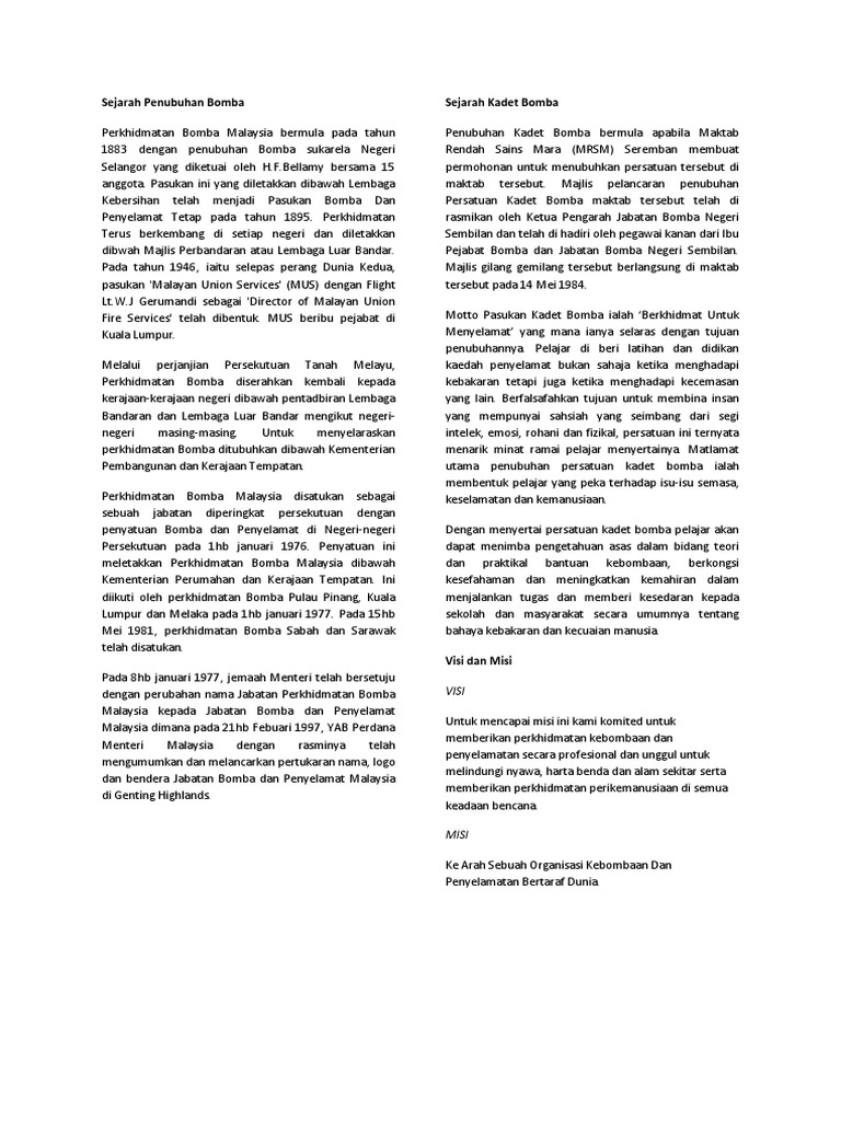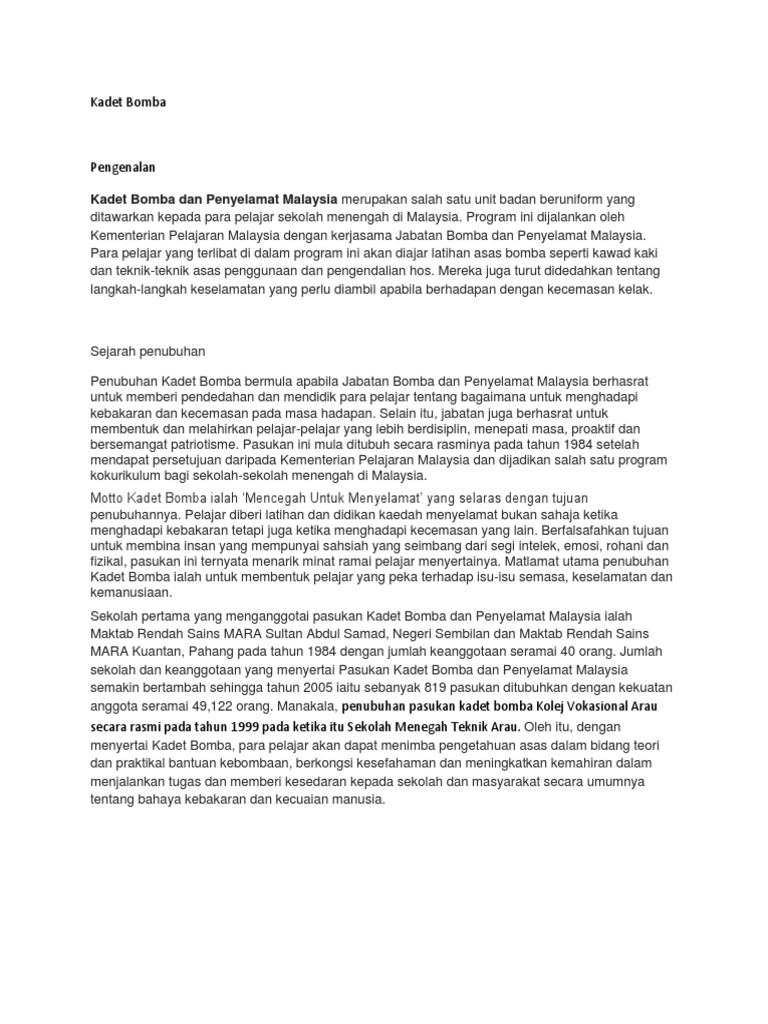 Sejarah kadet bomba dan penyelamat malaysia. Kadet Bomba dan Penyelamat Malaysia merupakan salah satu unit badan beruniform yang ditawarkan kepada para pelajar sekolah menengah di Malaysia. Pada tahun 1883 pasukan bomba sukarela yang pertama di Malaya dan Selangor telah ditubuhkan dengan dianggotai seramai 15 orang yang diketuai oleh H. Persatuan Kadet Bomba School Uniform Panduan Penubuhan Pasukan Kadet Bomba Dan Penyelamat Malaysia Pdf Download Gratis Unit Kokurikulum Smk Permatang Pasir Kadet Bomba Penyelamat.