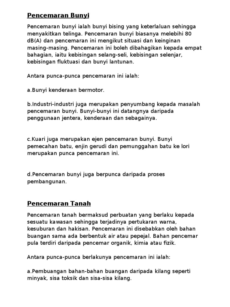 Punca-Punca Pencemaran Bunyi 1 Pembangunan Industri. Definisi pencemaran bunyi pencamaran bunyi bermaksud bunyi bising yang keterlaluan yang boleh memekakkan telinga sesiapa yang mendengarnya pencemaran bunyi biasanya melebihi 80 desibel db. Kuala Lumpur terutamanya antara pencemar bunyi terbesar di Malaysia.