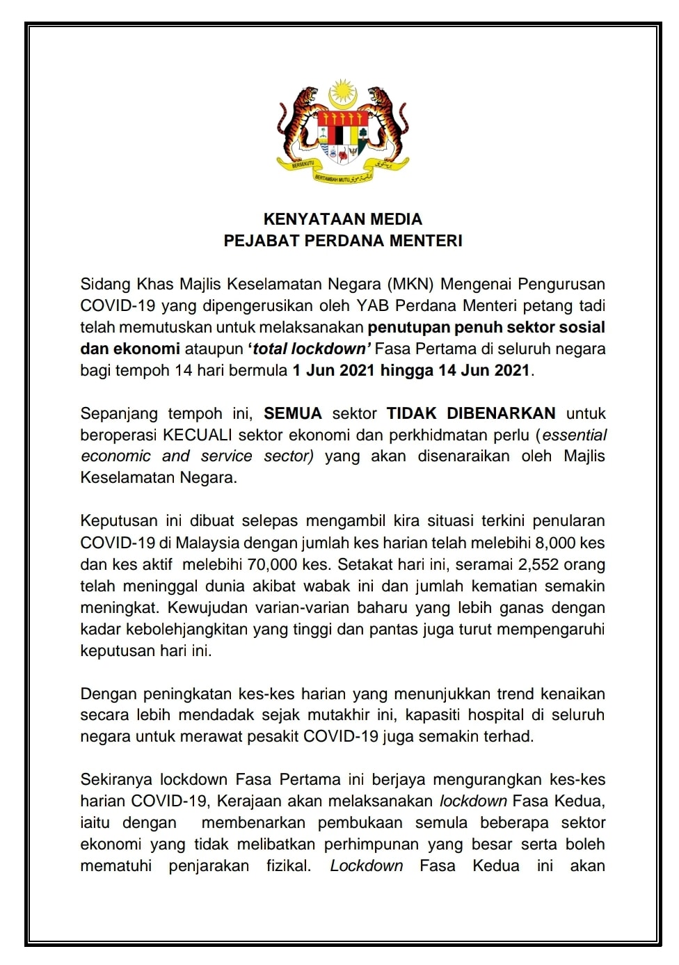 KUALA LUMPUR 11 Jan -- Kerajaan membenarkan lima sektor ekonomi perlu beroperasi sewaktu Perintah Kawalan Pergerakan PKP yang akan dilaksanakan untuk tempoh selama 14 hari mulai Rabu 13 Jan kata Perdana Menteri Tan Sri Muhyiddin Yassin. Disebabkan peningkatan kes COVID-19 saban hari kerajaan terpaksa umumkan total lockdown yakni PKP 30 selama 2 minggu bermula 1 Jun 2021 hingga 14 Jun 2021.