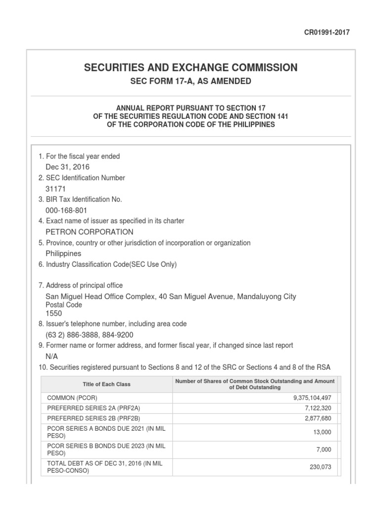 04 07 17 Petron Annual Report 2016 Sec Form 17 A As Filed With Sec On April 6 2017 Securities Finance Motor Oil