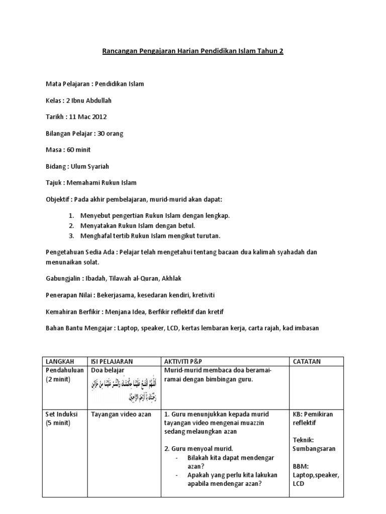 Rancangan Pengajaran Harian Pendidikan Islam Tahun 2