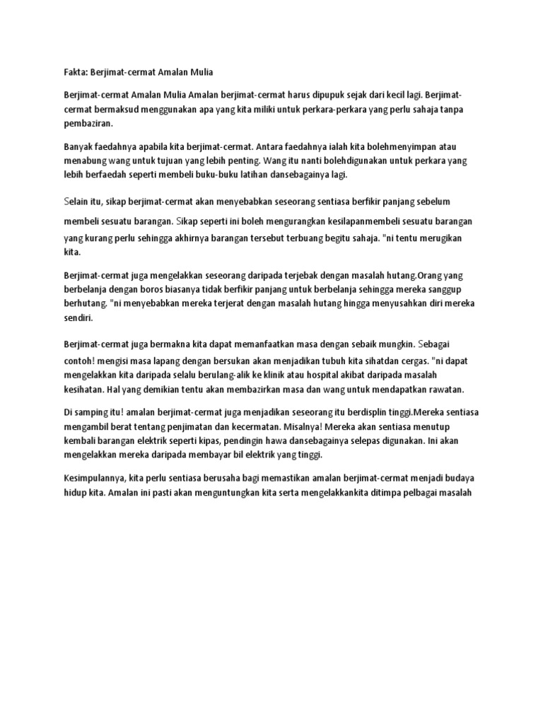 August 20 2008 105600 pm soalan. Cara-Cara Memupuk Amalan Berjimat Cermat Berjimat cermat merupakan amalan yang baik dan perlu dipertingkatkan dari semasa ke semasa. Amalan berjimat cermat merupakan sikap yang mulia dan seharusnya dipraktikkan sepenuhnya oleh masyarakat malaysia apatah lagi dengan keadaan harga barangan yang semakin meningkat kesan daripada kenaikan harga bahan bakar di pasaran dunia.