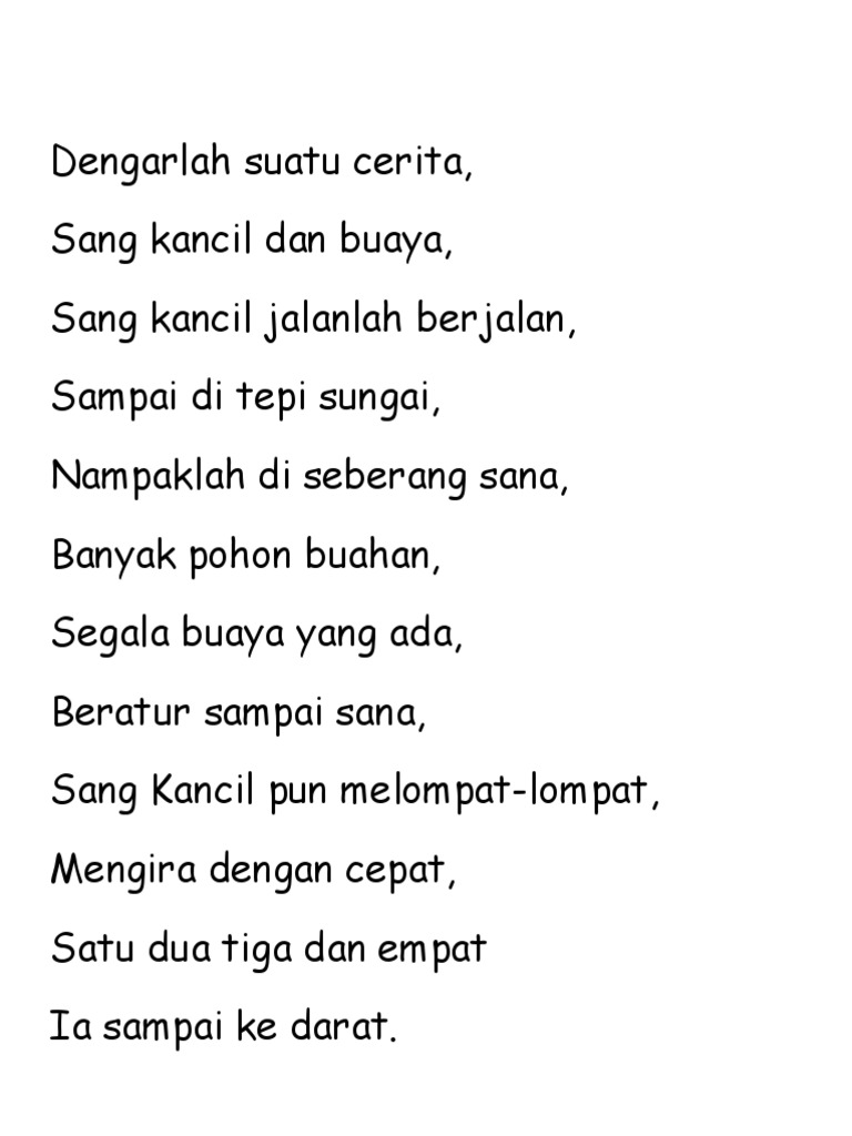 Sang kancil dan buaya cerita pendek. Dongeng Kancil dan Para Buaya Ambil Pelajaran dari Cerita Ini. Sang Kancil mengambil sepotong kayu yang berada di situ lalu melompat ke atas buaya yang pertama di tepi sungai dan ia mulai menghitung dengan menyebut Satu dua tiga lekuk jantan betina aku ketuk sambil mengetuk kepala buaya hingga Kancil berjaya menyeberangi sungai. Ia hidup di hutan bersama hewan-hewan lainnya diantaranya adalah kerbau gajah kelinci dan masih banyak lagi.