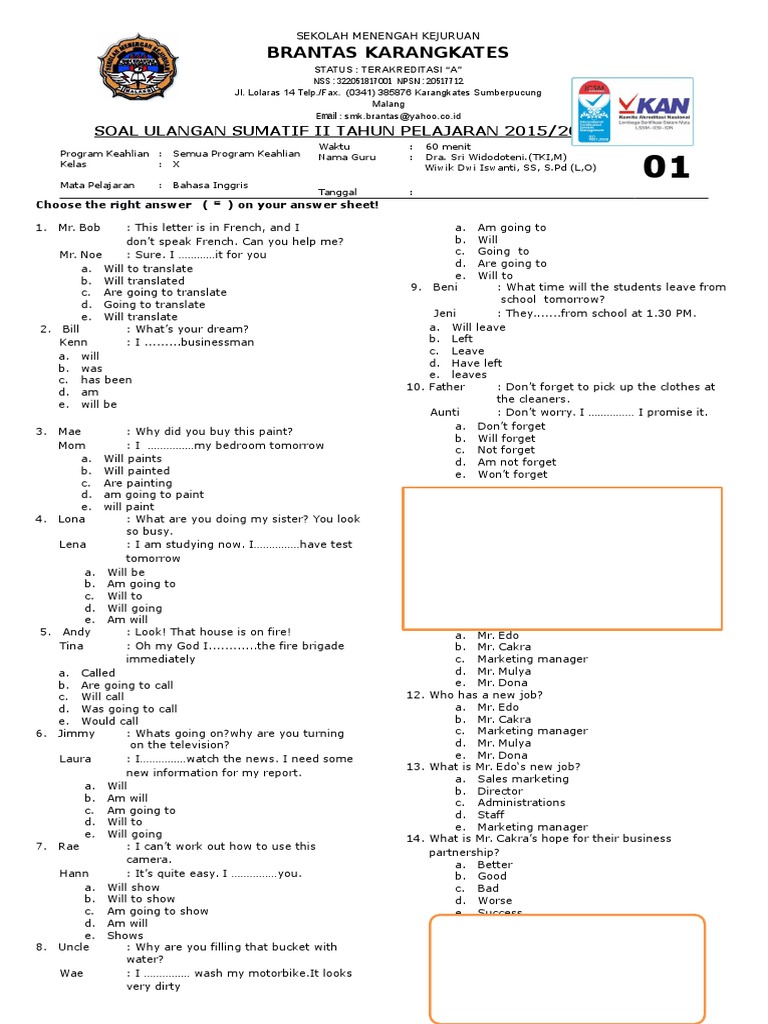 Soal Bahasa Inggris Uts Smk Baitul Hamdi Ap 1 Ganjil Revisi
