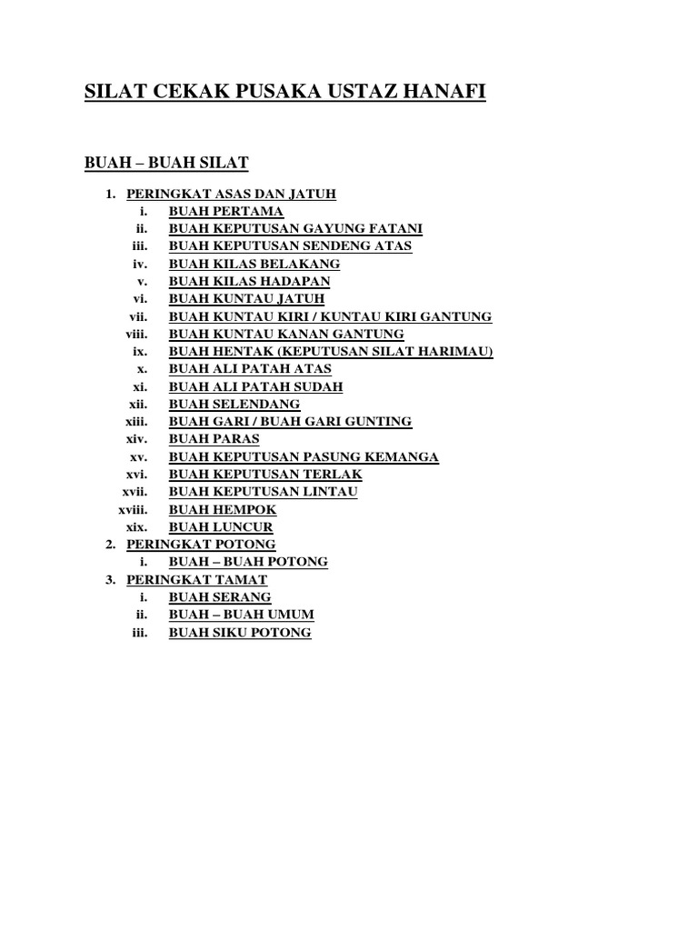 33 rows Untuk ahli sahaja Senarai Buah-buah SILAT CEKAK HANAFI Bil Nama Buah Kod Catatan Asas Jatuh Potong 1 Buah Pertama A1 J1 P1 2 Buah Keputusan Gayung Fatani A2 J2 1 P2 J2 2 J2 3 J2 4 3 Buah Keputusan Sendeng Atas A3 J3 P3 4 Buah Kilas Belakang A4 J4 P4 5 Buah. Kaedah A adalah diilhamkan daripada gerakan doa. Salahsilah perguruan Silat Cekak Ustaz Hanafi diketahui melalui kaedah penyampaian dari mulut k emulut guruNamu begitu tidak pernah diketahui siapakah yang mula-mula mencipta silat ini.